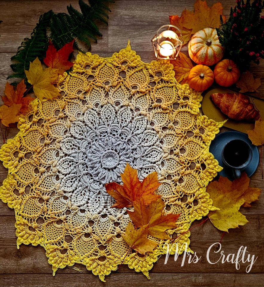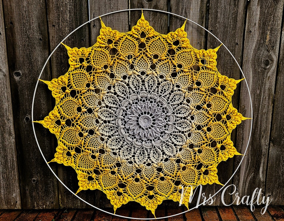 My Antonia was crafted using a blend of acrylic and cotton yarn in a custom color palette: light gray, cream, yellow, and intense yellow. I used a 2.25mm crochet hook and approximately 840 meters of yarn. The finished mandala can be stretched to fit a hoop with a diameter of 85cm.